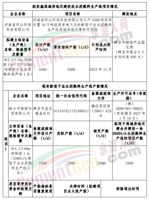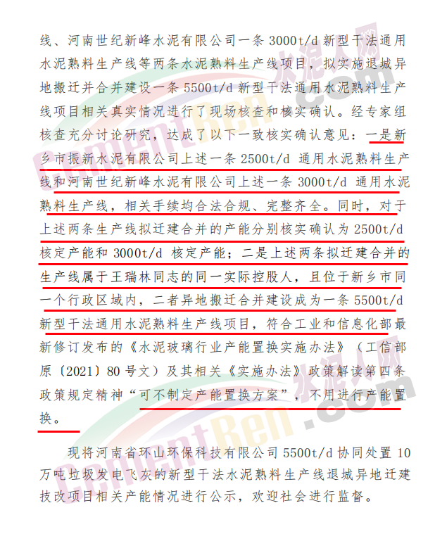公示文件稱,新鄉(xiāng)市振新水泥有限公司和河南世紀(jì)新峰水泥有限公司擬實施退城異地搬遷合并成立河南省環(huán)山環(huán)保科技有限公司建設(shè)一條日產(chǎn)5500噸新型干法水泥熟料生產(chǎn)線協(xié)同處置10萬噸垃圾發(fā)電飛灰項目,按照《水泥玻璃行業(yè)產(chǎn)能置換實施辦法》(工信部原〔2021〕80號)相關(guān)政策規(guī)定,工業(yè)和信息化部原材料工業(yè)司、省工業(yè)和信息化廳、新鄉(xiāng)市工業(yè)和信息化局分別復(fù)函確認(rèn) “新鄉(xiāng)市振新水泥有限公司2500t/d新型干法通用水泥熟料生產(chǎn)線和河南世紀(jì)新峰水泥有限公司3000t/d新型干法通用水泥熟料生產(chǎn)線,如確屬不擴(kuò)大產(chǎn)能異地搬遷合并項目,且符合相關(guān)《辦法》規(guī)定的遷建條件,可依據(jù)該《辦法》規(guī)定不制定產(chǎn)能置換方案,但應(yīng)公示、公告項目遷建情況,主動接受監(jiān)督”。