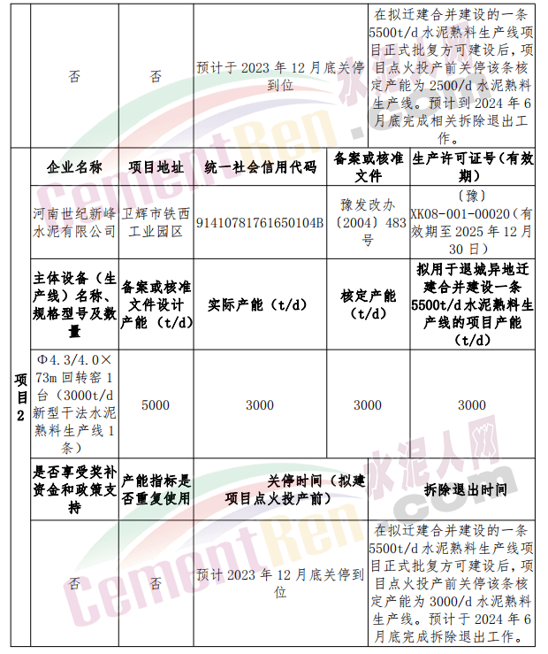 一是新鄉(xiāng)市振新水泥有限公司上述一條2500t/d 通用水泥熟料生產(chǎn)線和河南世紀(jì)新峰水泥有限公司上述一條3000t/d 通用水泥熟料生產(chǎn)線,相關(guān)手續(xù)均合法合規(guī)、完整齊全。同時,對于上述兩條生產(chǎn)線擬遷建合并的產(chǎn)能分別核實確認(rèn)為2500t/d 核定產(chǎn)能和3000t/d 核定產(chǎn)能;