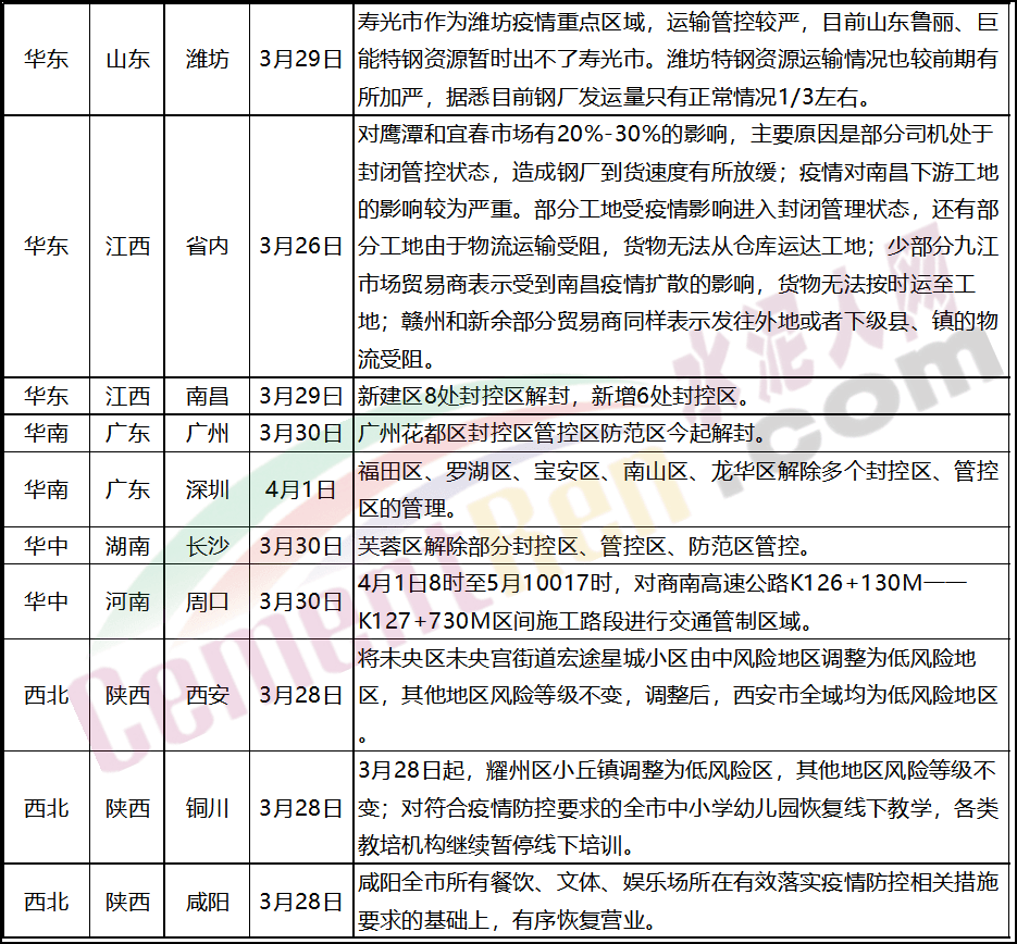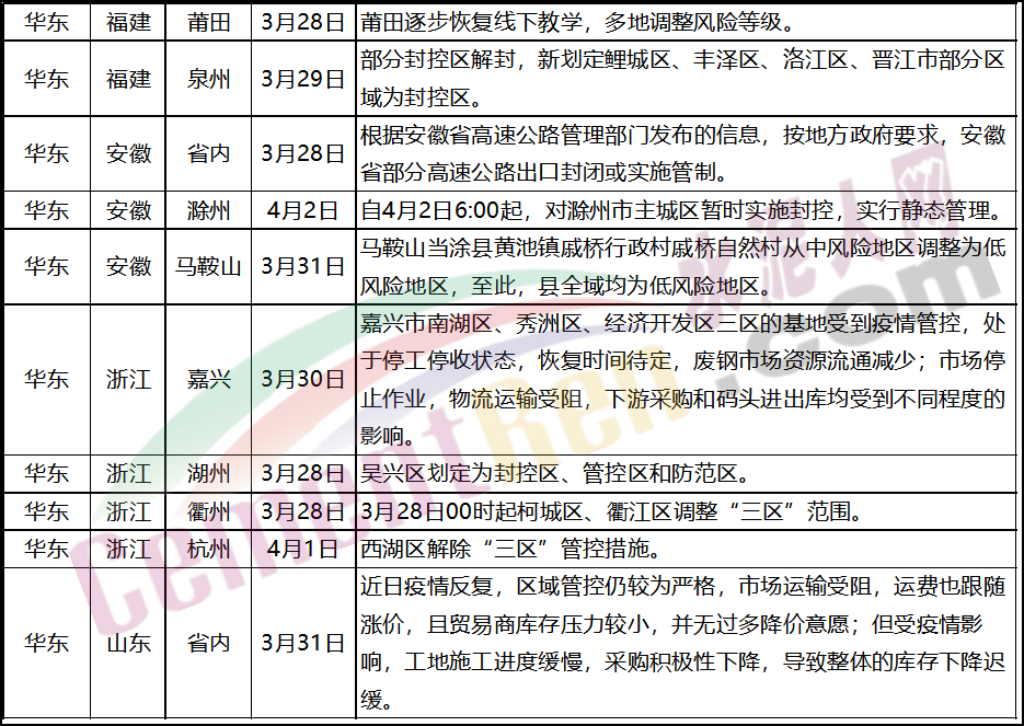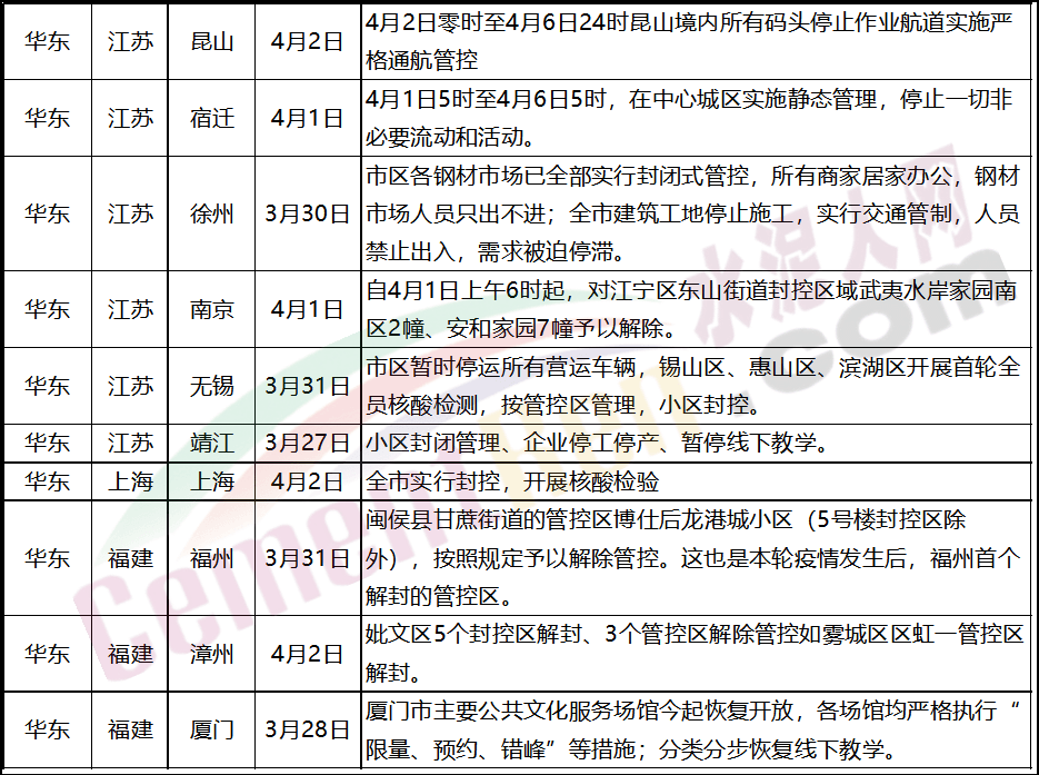 江蘇昆山4月2日零時(shí)至4月6日24時(shí)昆山境內(nèi)所有碼頭停止作業(yè)航道實(shí)施嚴(yán)格通航管控;江蘇宿遷4月1日5時(shí)至4月6日5時(shí),在中心城區(qū)實(shí)施靜態(tài)管理,停止一切非必要流動(dòng)和活動(dòng);安徽滁州自4月2日6:00起,對滁州市主城區(qū)暫時(shí)實(shí)施封控,實(shí)行靜態(tài)管理。