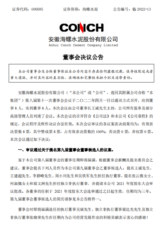 日前,海螺水泥發布公告稱,安徽海螺水泥股份有限公司第八屆第十一次董事會審議通過關于提名第九屆董事會董事候選人的議案。根據董事會薪酬及提名委員會之建議,董事會提名王誠先生、王建超先生、李群峰先生、周小川先生和吳鐵軍先生擔任執行董事,提名張云燕女士、何淑懿女士和屈文洲先生擔任第九屆董事會獨立非執行董事。各董事的任職于2021年度股東大會選舉通過之日起生效,任期均為三年。