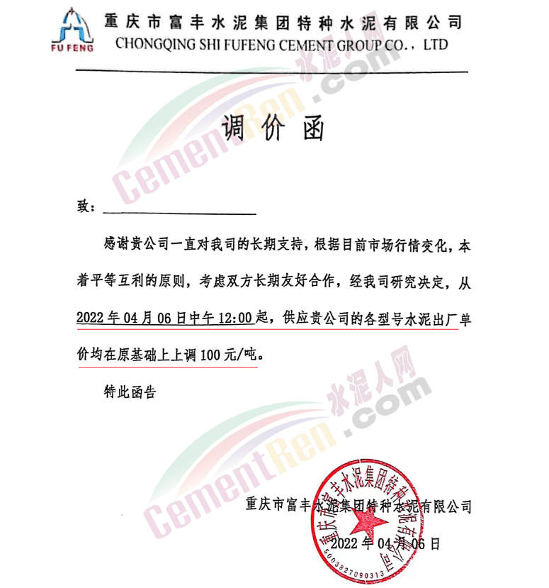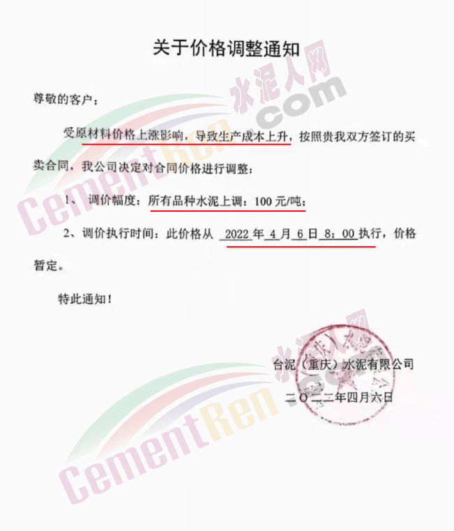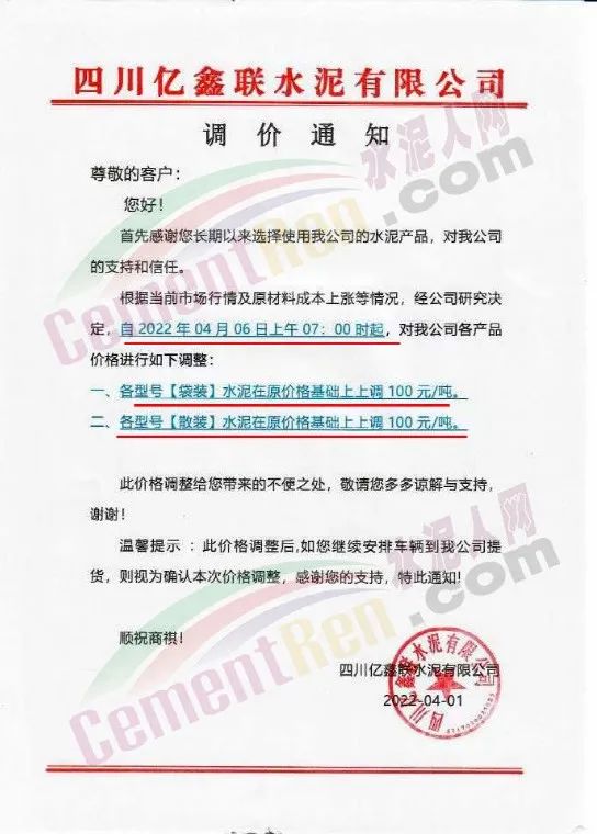 四川億鑫聯水泥有限公司通知,根據當前市場行情原材料成本上漲等情況,經公司研究決定自4月6日上午7時起,對各型號水泥在原價基礎上上調100元/噸。