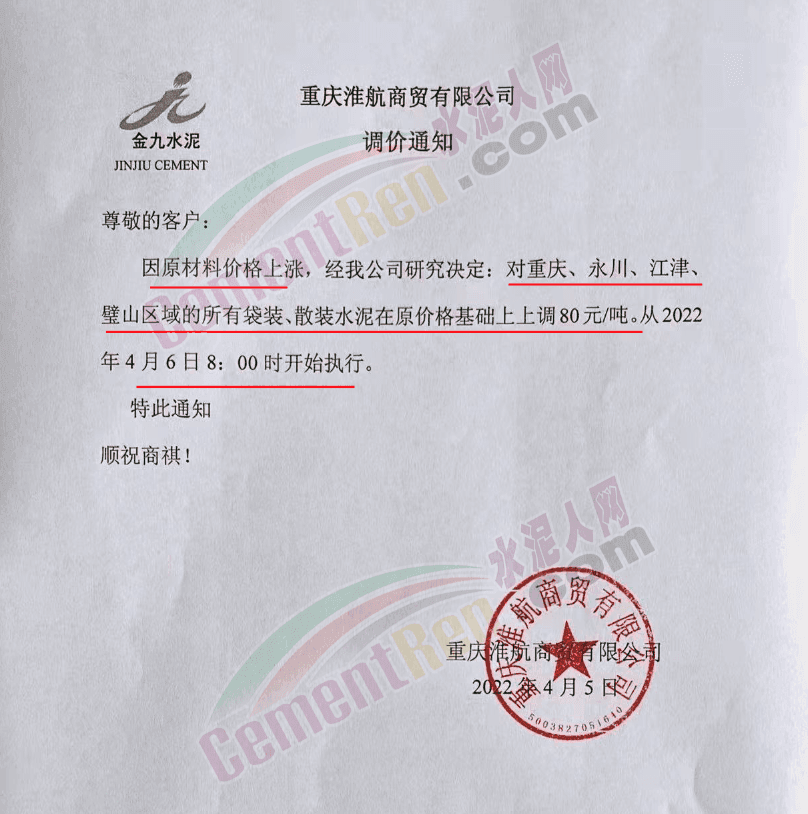 重慶淮航商貿有限公司通知,因原材料價格上漲,經公司研究決定從4月6日8時起對重慶 、永川、江津、璧山區域的所有袋裝、散裝水泥上調80元/噸。