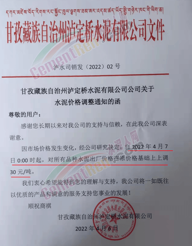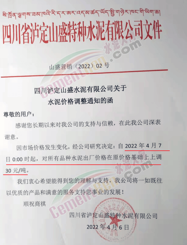 四川甘孜藏族自治州瀘定橋水泥有限公司及瀘定山盛特種水泥有限公司兩家水泥企業通知,因市場價格發生變化,經公司研究決定上調水泥價格30元/噸。