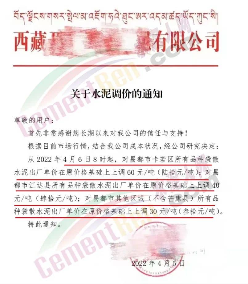 安徽六安霍邱縣金鈦水泥有限責任公司發通知稱,因疫情防控導致交通不便,致使原材物料持續不斷上漲并無法購進。經公司研究決定從2022年4月6日早上7點起,32.5及42.5袋裝水泥分別上調10元/噸;32.5及42.5散裝水泥分別上調30元/噸。