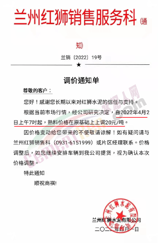 蘭州紅獅銷售服務科通知。根據當前市場行情,經公司研究決定,自2022年4月2日上午7時起,熟料價格在原基礎上上調20元/噸。據了解,這是蘭州紅獅近一個月來的第二次熟料調價,企業還曾于3月26日上調熟料價格20元/噸,兩次調價累計上調40元/噸。
