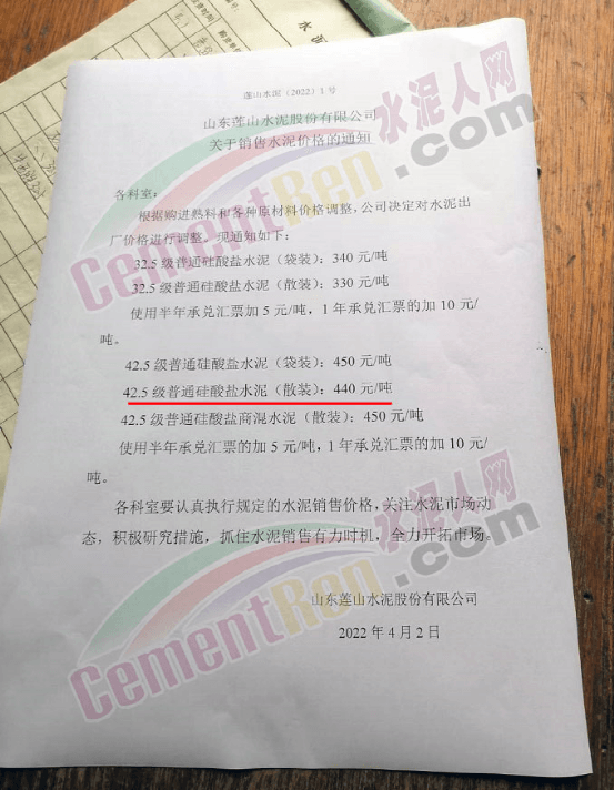 4月2日,山東蓮山水泥通知稱,根據購進熟料和各種原材料價格調整,公司決定對水泥出廠價格進行調整,調整后42.5級散裝水泥報價440元/噸,商混用散裝42.5普通硅酸鹽水泥報價450元/噸,半年承兌匯票加5元/噸,1年承兌匯票加10元/噸。