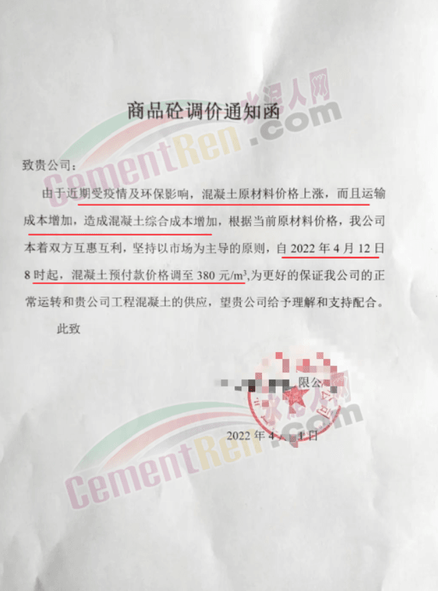 另一企業通知稱,近期因環境治理問題,石家莊市砂石料場限制開采,造成混凝土原材料價格大幅上漲,且供應困難,柴油價格大幅度上漲,致使公司生產成本大幅增加,鑒于以上情況,公司決定自4月11日起普通混凝土C30預付款價格調至380元/立方。其他標號的商品混凝土在原合同基礎上作相應調整 。