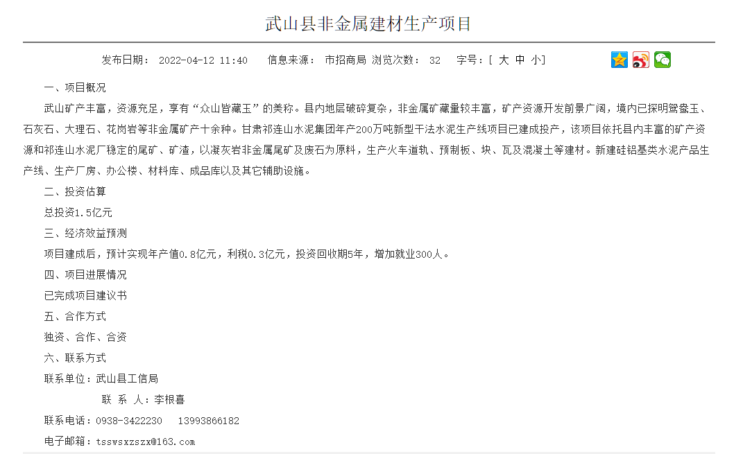 日前,甘肅天水市招商局發(fā)布了《武山縣非金屬建材生產(chǎn)項目》招商引資推介項目消息稱,甘肅祁連山水泥集團(tuán)年產(chǎn)200萬噸新型干法水泥生產(chǎn)線項目已建成投產(chǎn),該項目依托縣內(nèi)豐富的礦產(chǎn)資源和祁連山水泥廠穩(wěn)定的尾礦、礦渣,以凝灰?guī)r非金屬尾礦及廢石為原料,生產(chǎn)火車道軌、預(yù)制板、塊、瓦及混凝土等建材。新建硅鋁基類水泥產(chǎn)品生產(chǎn)線、生產(chǎn)廠房、辦公樓、材料庫、成品庫以及其它輔助設(shè)施。