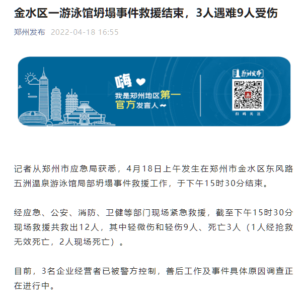 鄭州發布官微4月18日16:55分消息,4月18日上午發生在鄭州市金水區東風路五洲溫泉游泳館局部坍塌事件救援工作于下午15時30分結束。
