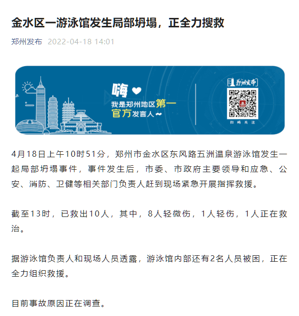 據鄭州發布官微18日下午14:01分消息,4月18日上午10時51分,鄭州市金水區東風路五洲溫泉游泳館發生一起局部坍塌事件,事件發生后,市委、市政府主要領導和應急、公安、消防、衛健等相關部門負責人趕到現場緊急開展指揮救援。截至13時,已救出10人,其中,8人輕微傷,1人輕傷,1人正在救治。據游泳館負責人和現場人員透露,游泳館內部還有2名人員被困,正在全力組織救援。