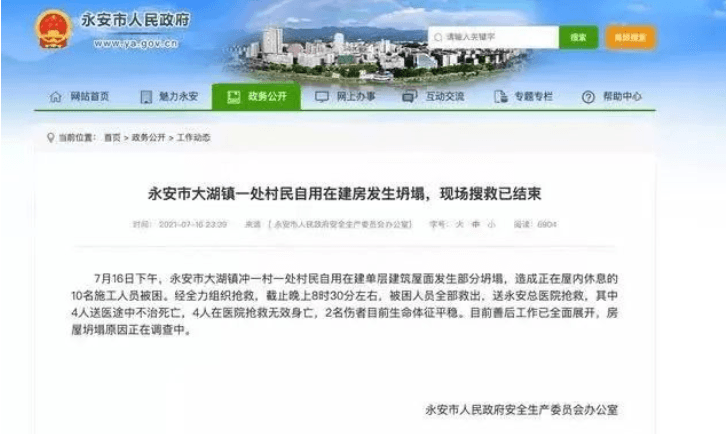 ▲2021年7月16日,福建三明永安市大湖鎮沖一村一處村民自用在建單層建筑屋面發生部分坍塌,造成正在屋內休息的10名施工人員被困。其中4人送醫途中不治死亡,4人在醫院搶救無效身亡。