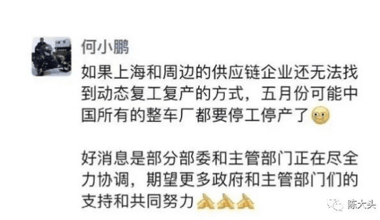 小鵬汽車董事長何小鵬在朋友圈發文稱,如果上海和周邊的供應鏈企業還無法找到動態復工復產的方式,五月份可能中國所有的整車廠都要停工停產了。