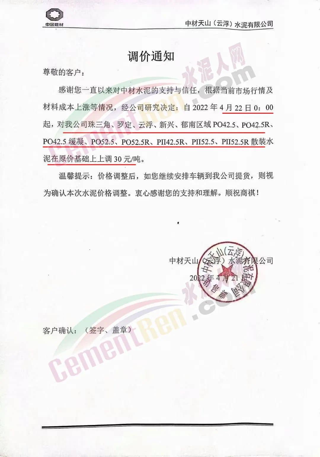 中材天山(云浮)水泥有限公司通知,根據當前市場行情及材料成本上漲情況,經公司研究決定,自4月22日0時起對公司珠三角、羅定、云浮、新興、郁南區域P.O42.5、P.O42.5R、P.O42.5緩凝、P.O52.5、P.O52.5R、PII42.5R、PII52.5、PII52.5R散裝水泥在原價基礎上上調30元/噸。