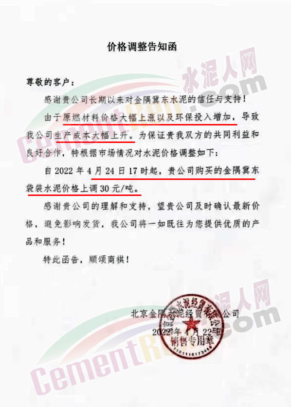 日前,北京金隅水泥經(jīng)貿(mào)公司通知,由于原燃材料價格大幅上漲以及環(huán)保投入增加,導(dǎo)致公司生產(chǎn)成本大幅上升。根據(jù)市場情況自2022年4月24日17時起,金隅冀東袋裝水泥價格上調(diào)30元/噸。