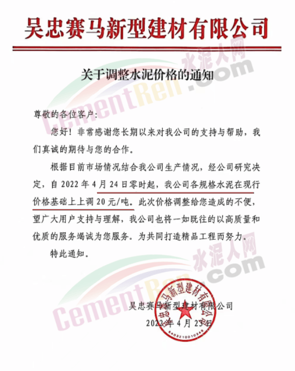 吳忠賽馬新型建材有限公司通知,根據(jù)目前市場況結(jié)合公司生產(chǎn)情況,自2022年4月24日零時起,公司各規(guī)格水泥在現(xiàn)行價格基礎(chǔ)上上調(diào)20元/噸。