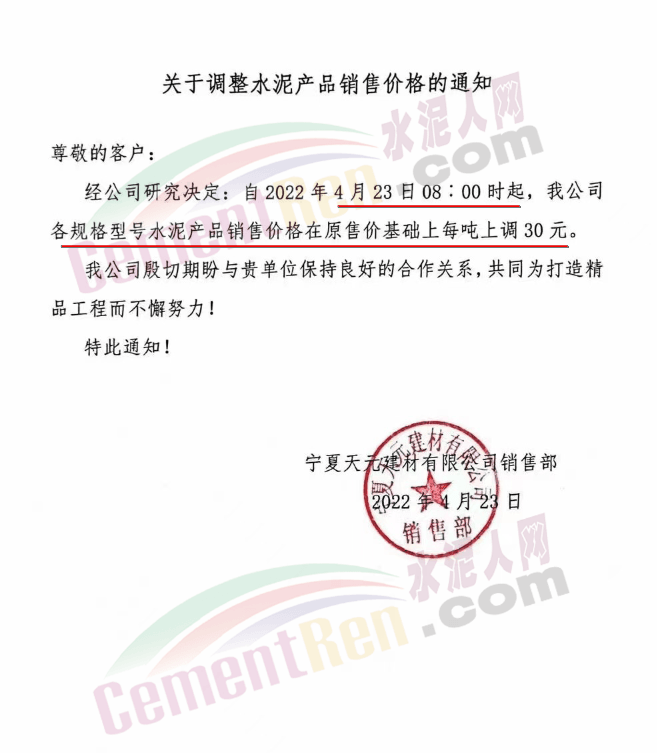 寧夏天元建材有限公司銷售部通知,自2022年4月23日8時起,公司各規(guī)格型號水泥產(chǎn)品銷售價格在原售價基礎(chǔ)上每噸上調(diào)30元。