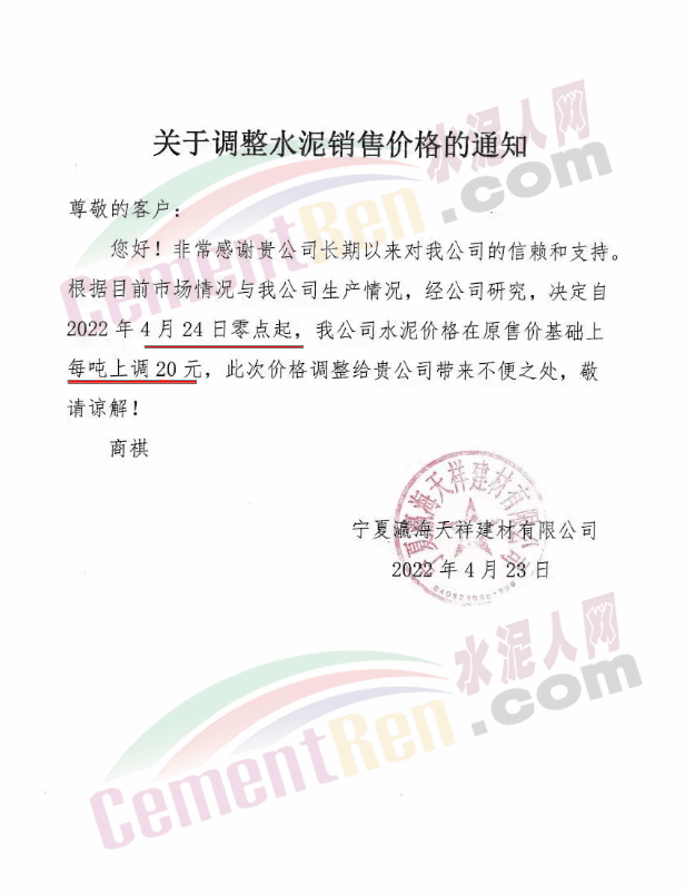 寧夏瀛海天祥建材有限公司通知,根據(jù)目前市場情況與公司生產(chǎn)情況,經(jīng)公司研究,決定自2022年4月24日零點起,公司水泥價格在原售價基礎(chǔ)上上調(diào)20元/噸。