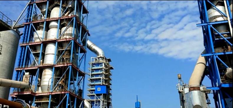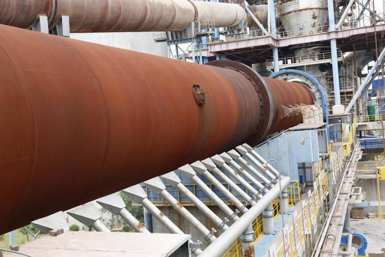 棕黃色的生粉經(jīng)旋風(fēng)預(yù)熱器和分解爐等送到旋轉(zhuǎn)的大窯內(nèi)。