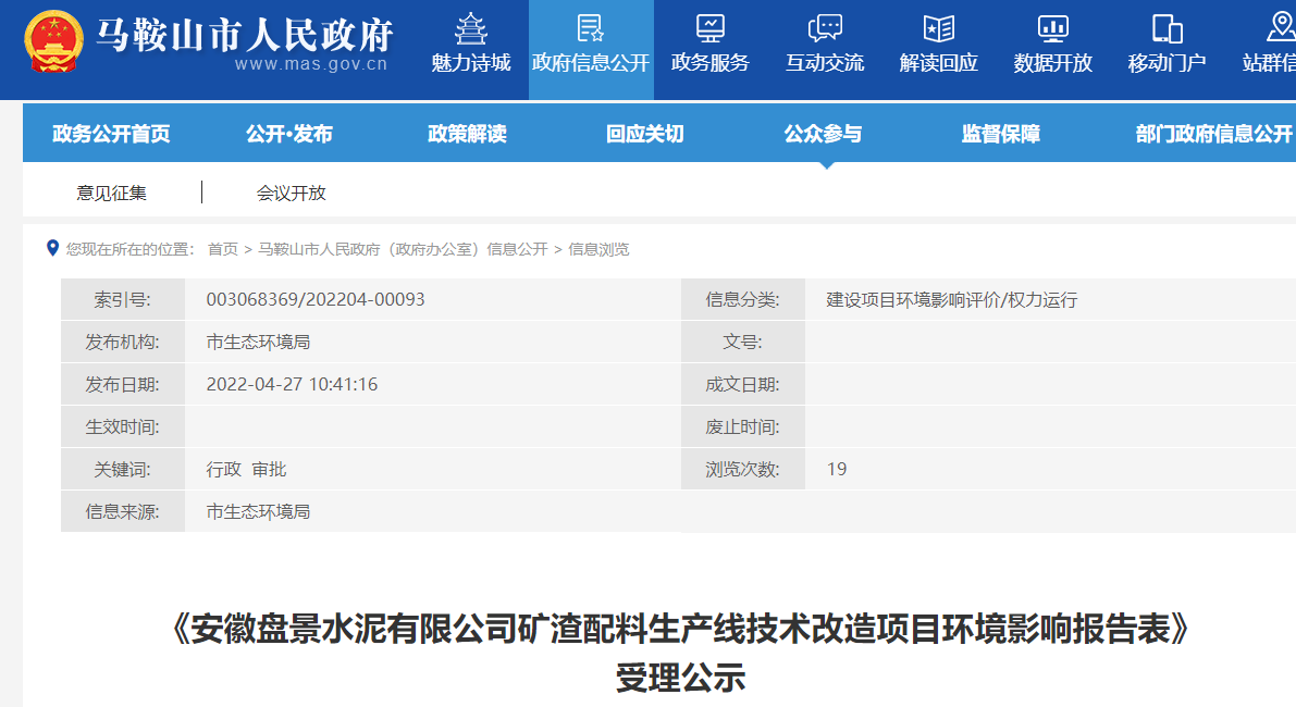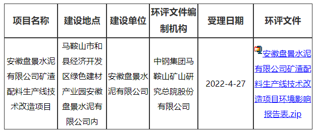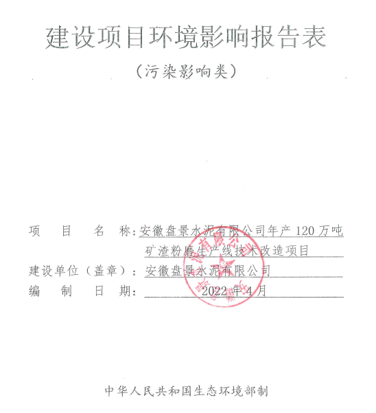 2022年4月27日,我局受理了《安徽盤景水泥有限公司礦渣配料生產(chǎn)線技術改造項目環(huán)境影響報告表》