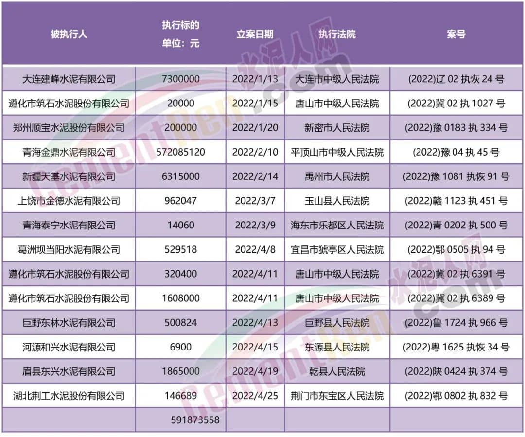 據(jù)相關(guān)數(shù)據(jù)顯示,今年以來涉及司法風(fēng)險(xiǎn)被執(zhí)行標(biāo)的的水泥公司共有12家,執(zhí)行標(biāo)的合計(jì)金額約5.92億。