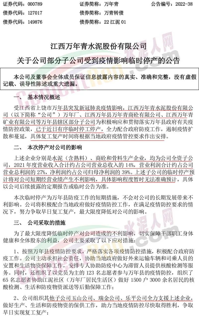 上述企業分別是水泥(含熟料)、商砼和骨料生產企業,均為公司全資子公司,2021年度營業收入合計約占公司營業總收入的14%,營業利潤合計約占公司營業總利潤的27%,凈利潤約占公司歸母凈利潤的39%。上述子公司的臨時停產預計將對公司短期經營業績產生不利影響,具體影響程度暫時無法準確預計,具體以公司后續披露的定期報告或臨時公告為準。
