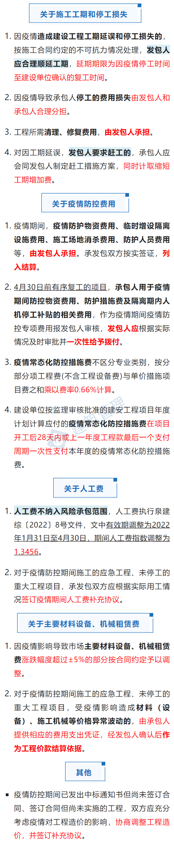 為貫徹落實市委市政府關于復工復產的決策部署,加快推動企業在保證疫情防控的前提下恢復生產,更好維護建筑市場各方合法權益,根據泉州市防控新型冠狀病毒感染的肺炎疫情應急指揮部復工復產工作服務小組《關于促進建筑業復工復產工作的通知》(泉復工復產城建〔2022〕1號)文件精神,現就我市受新冠肺炎疫情影響建設工程計價問題提出以下指導意見,請遵照執行。