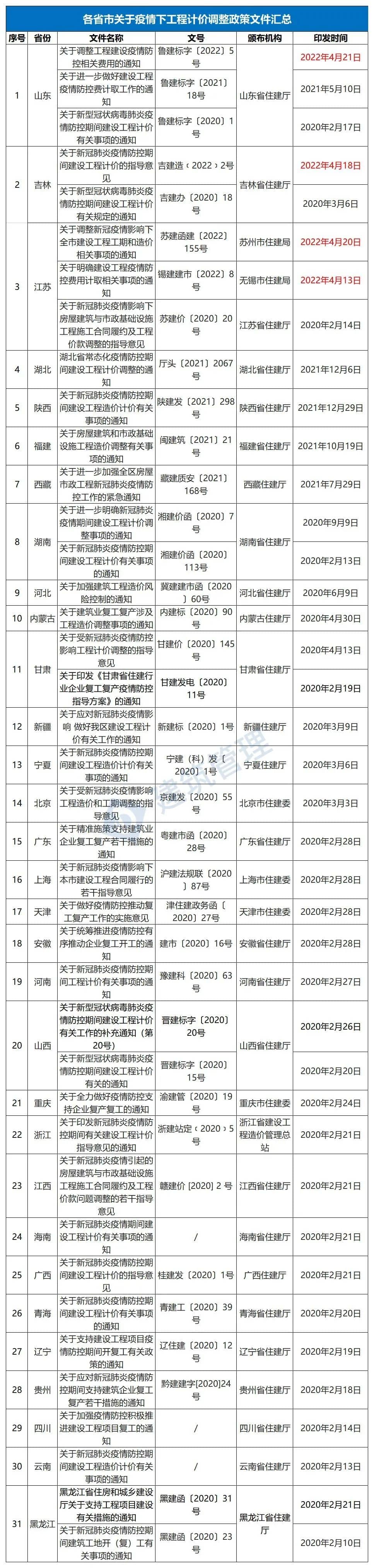 截至目前,各省市在疫情防控期間建設工程計價政策文件如下: