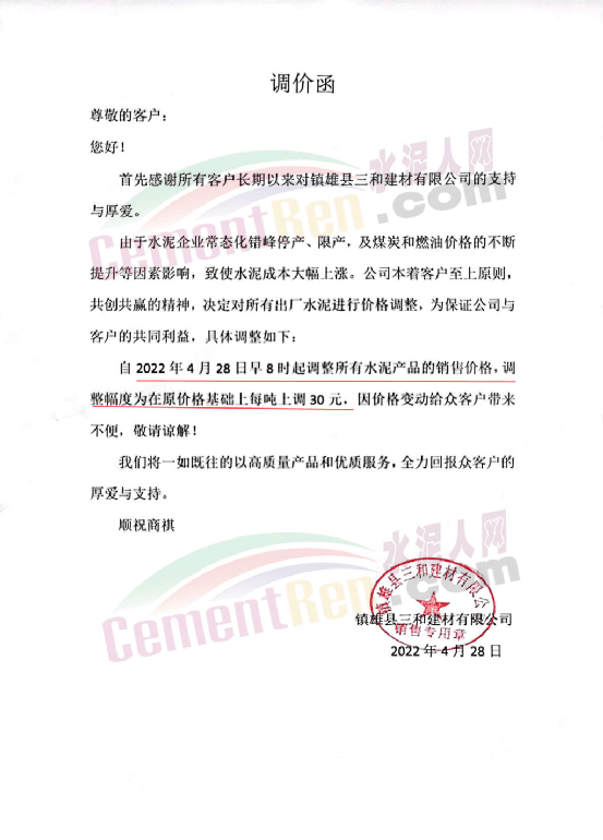 鎮雄縣三和建材有限公司通知由于水泥企業常態化錯峰停產、限產,及煤炭和燃油價格的不斷提升等因素影響,致使水泥成本大幅上漲。公司本著客戶至上原則,共創共贏的精神,決定對所有出廠水泥進行價格調整,為保證公司與客戶的共同利益,自4月28日早8時起調整所有水泥產品的銷售價格,調整幅度為在原價格基礎上上調30元/噸。