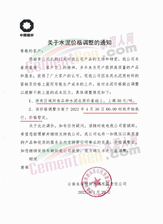 云南永保特種水泥有限責任公司通知,因各類水泥原材料的緊缺及價格上漲而導致生產成本的上升,故對水泥價格做出調整以緩解不斷上漲的成本壓力,自2022年4月30日0時起所有區域所有品種水泥在原價基礎上上調 30元/噸。