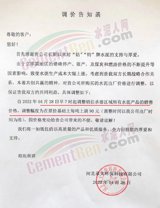 河北承大環保科技通知,由于京津冀地區的錯峰停產、限產,及煤炭和燃油價格的不斷提升等因素影響,致使水泥生產成本大幅上漲。自4月28日早7時起調整銷往承德區域所有水泥產品的銷售價格,調整幅度為在原價基礎上每噸上調90元。