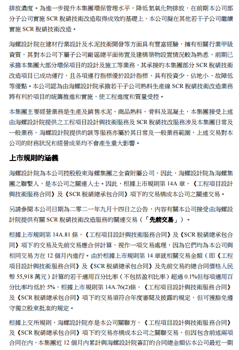 SCR脫硝技改服務,2022年4月29日,本公司與海螺設計院簽署《SCR脫硝總承包合同》,根據該合同,海螺設計院將為本公司若干子公司之熟料生產線提供SCR脫硝技術改造服務,注合同價格為人民幣12,750萬元(約相當于港幣15,118萬元)。