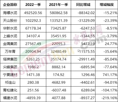 截至目前,絕大多數(shù)水泥上市公司都已發(fā)布了2022年一季度報告。從營業(yè)收入和業(yè)績來看,絕大多數(shù)企業(yè)業(yè)績未達預期。而近期各大企業(yè)陸續(xù)發(fā)布的一季度報告可見,絕大多數(shù)企業(yè)利潤環(huán)比下滑,其中福建水泥虧損4859.39萬元,同比下滑達219.16%。亞泰集團歸母凈利潤-4.57億元,冀東水泥歸母凈利潤-2.3億,西藏天路歸母凈利潤-5644.83萬元,虧損幅度擴大。