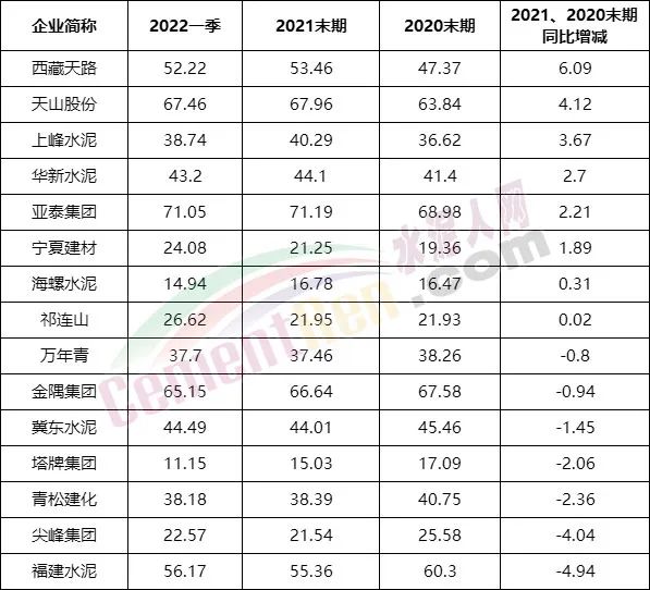 從各企業(yè)公布一季度財務(wù)數(shù)據(jù)來看,資產(chǎn)負債率較上年未有不同的變化。其中亞泰集團、天山股份、金隅集團、福建水泥、西藏天路等企業(yè)資產(chǎn)負債率均超過50%。西藏天路、天山股份、上峰水泥、華新水泥、亞泰集團、寧夏建材、海螺水泥、祁連山資產(chǎn)負債率同比均有增加。