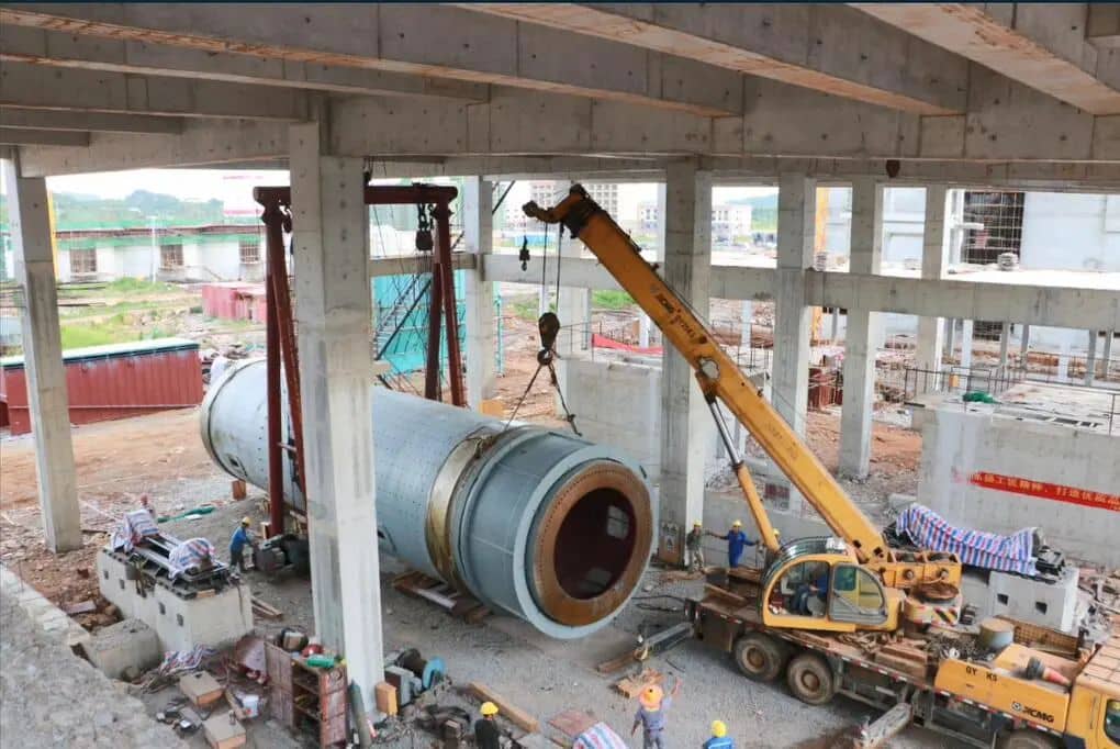 項目從開工之初就面臨著工期緊、任務重的難題。其中,水泥粉磨機吊裝施工是項目的一個重要施工環節,水泥磨筒體質重120噸,由于水泥磨車間空間狹小,大型起重機械無法進出吊裝,筒體需在車間外卸車,再將筒體移位至車間內進行安裝,為攻克這個重點難題,項目青年突擊隊員第一時間組織開會,討論解決方案,通過借鑒以往項目的施工經驗,根據項目實際情況編制了吊裝施工方案,方案采用滑輪組、卷揚機、龍門架等設備,組合成一套吊裝系統再采用汽車吊配合吊裝,在吊裝過程中出現了不少問題,隊員們勇于挑戰,迎難而上,經過多次試驗和十幾天的日夜奮戰,最終將兩臺水泥磨機成功精準就位。