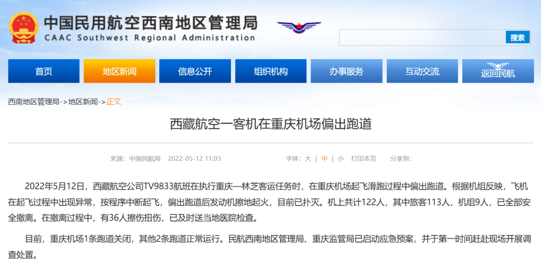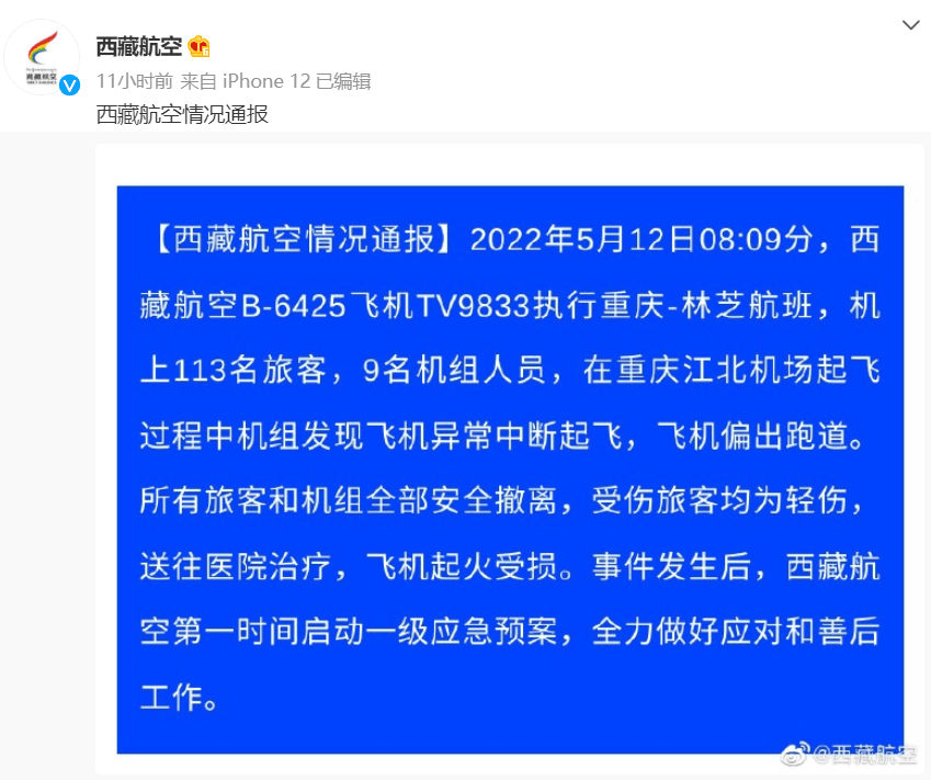 10時許,重慶機場官方微博通報:2022年5月12日08:09,西藏航空TV9833航班(重慶至林芝)在重慶江北國際機場起飛時偏出跑道,航空器機頭左側起火。重慶江北國際機場迅速啟動應急救援工作,公安、消防、醫療等應急救援力量迅速趕往事發地處置特情,全力保障機上人員生命安全。