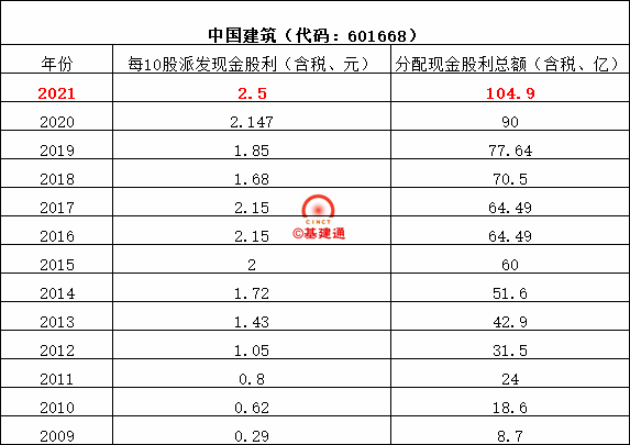 中國(guó)建筑2021年合并報(bào)表歸屬于上市公司股東凈利潤(rùn)為514.08億元,母公司累計(jì)未分配利潤(rùn)為 486.66億元,上市公司擬向全體股東每10股派發(fā)現(xiàn)金紅利2.5元(含稅)。總股本 41940858844股,以此計(jì)算合計(jì)擬派發(fā)現(xiàn)金紅利約104.9億元(含稅)。本年度現(xiàn)金分紅占合并報(bào)表歸屬于母公司股東凈利潤(rùn)的比例為20.40%。