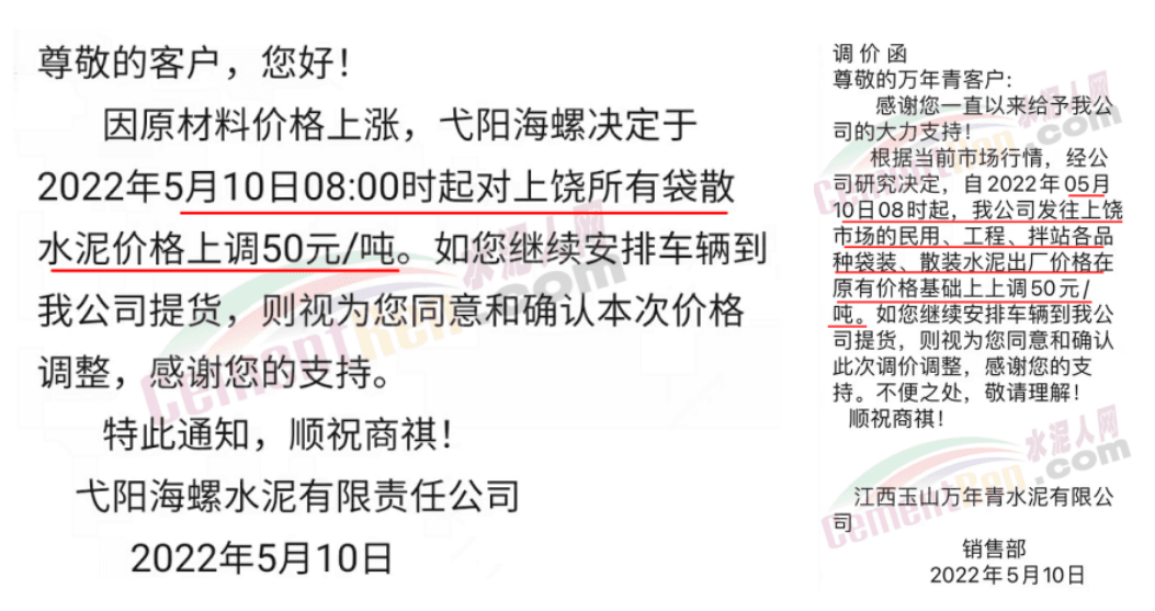 5月10日弋陽海螺水泥、江西萬年青,對(duì)上饒所有袋散水泥價(jià)格上調(diào)50元/噸。