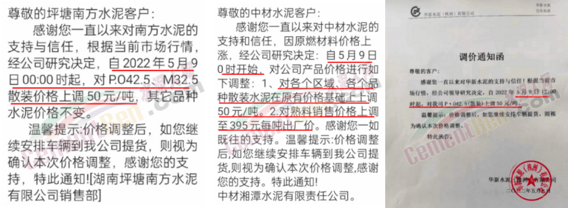 5月6日四川某水泥企業(yè)通知,對(duì)甘孜區(qū)域所有品種水泥出廠價(jià)上調(diào)30元/噸。