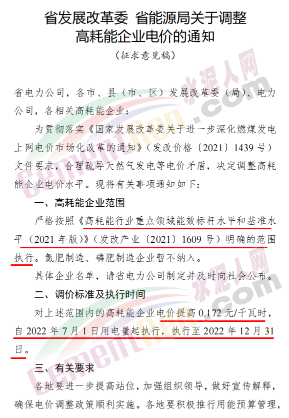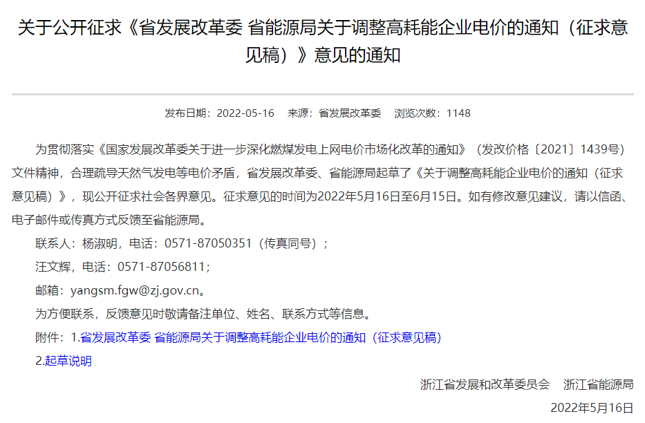 5月16日,浙江省發改委和能源局聯合發布“關于公開征求《省發展改革委省能源局關于調整高耗能企業電價的通知(征求意見稿)》意見的通知”稱,將對部分高耗能企業電價提高0.172元/千瓦時,自2022年7月1日用電量起執行,執行至2022年12月31日。從2023年起,這部高耗能企業電價將由市場化交易決定,且不受上浮20%限制。