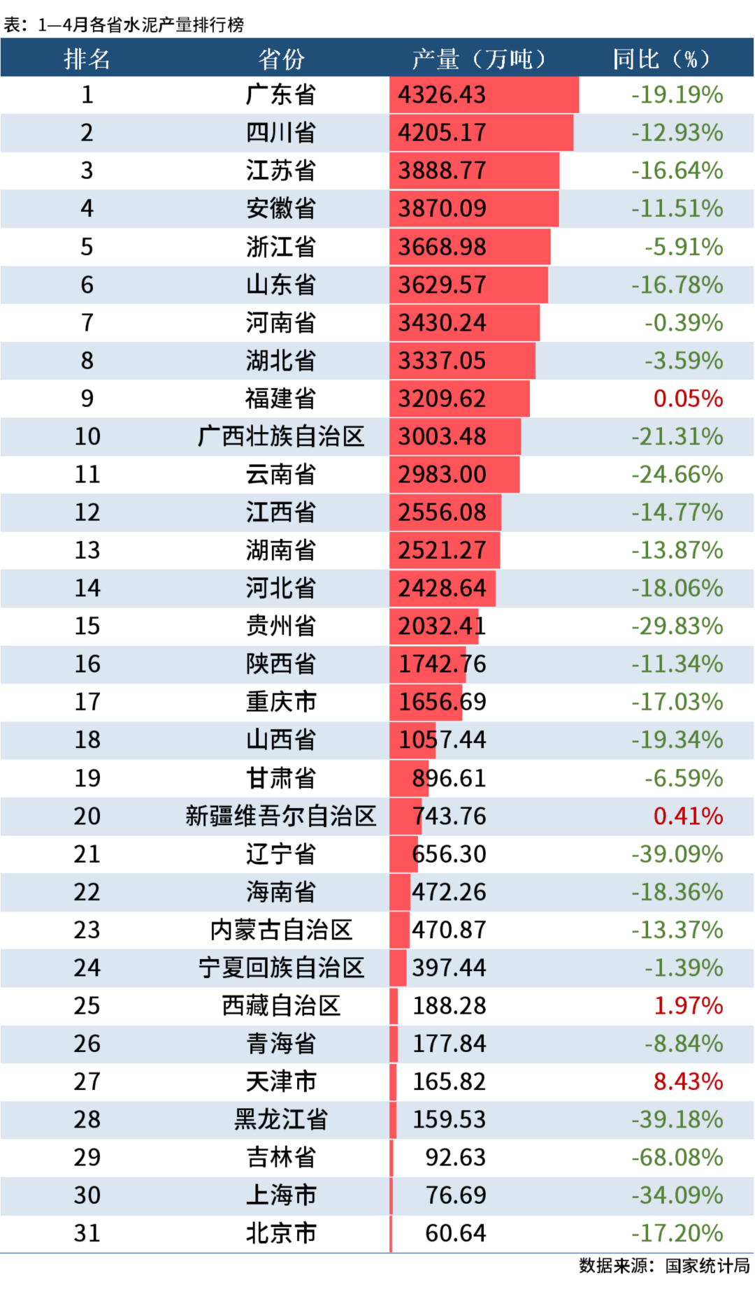 從分省數據來看,30省數市產量均有不同程度的下降,僅有福建省小幅增長0.86%。其中,4月全國14個省市水泥產量同比降幅超20%,上海降96.24%、吉林降72.73%,黑龍江降47.01%、遼寧降45.05%、江蘇降35.06%、貴州降28.48%,云南降26.84%、河北降24.38%、北京降23.08%、內蒙古降21.51%、山東降22.74%、安徽降低21.03%和廣東降20.94%。具體情況如下: