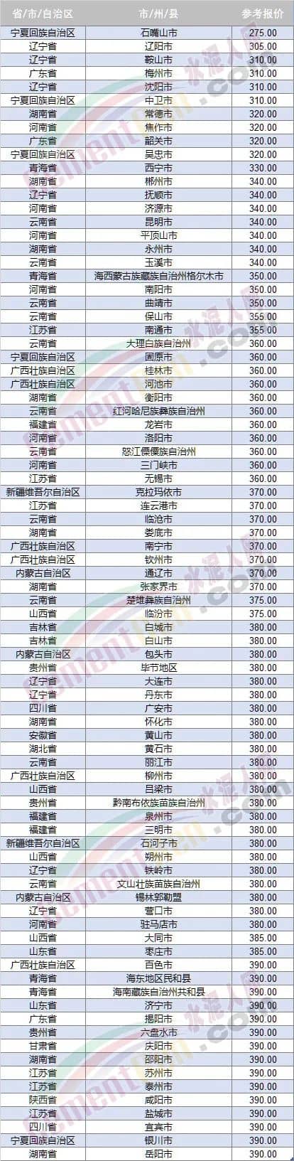 據水泥人網信息中心數據,盡管多區域主要品牌企業報價大幅拉抬,但落地執行價格仍相對較低,近期報價在400元/噸以下的區域包括寧夏、遼寧、廣東、河南、湖南、青海、云南、江蘇、福建、內蒙、山西、四川、貴州、湖北、安徽、甘肅 、陜西等近二十個省份、自治區。寧夏石嘴山賽馬水泥P.O42.5散裝水泥參考報價已降至300元/噸以下,報275元/噸。