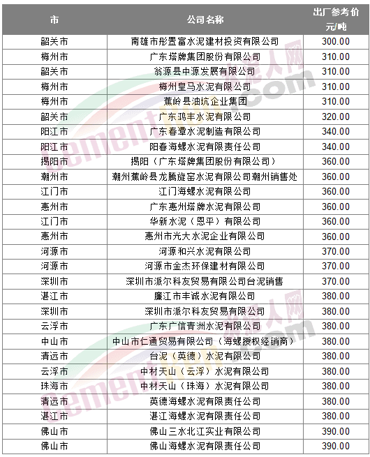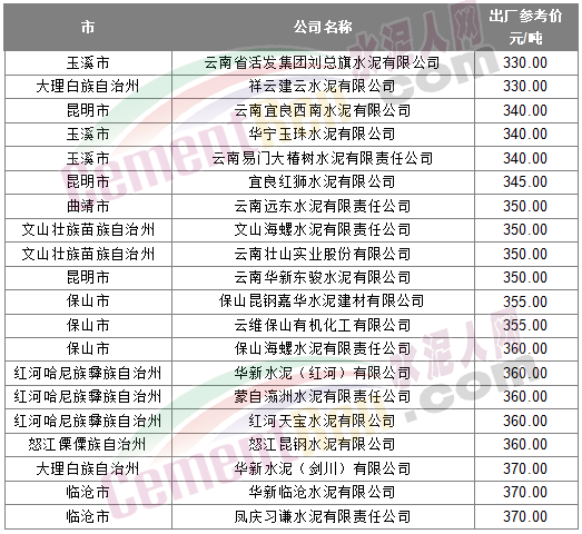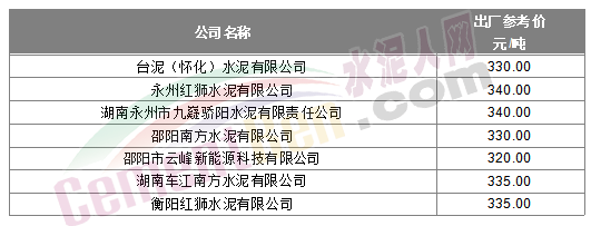 * 上述出廠參考價來源水泥人網信息中心人工采集,僅供參考。如與實際成交不符請以實際成交價格為準。