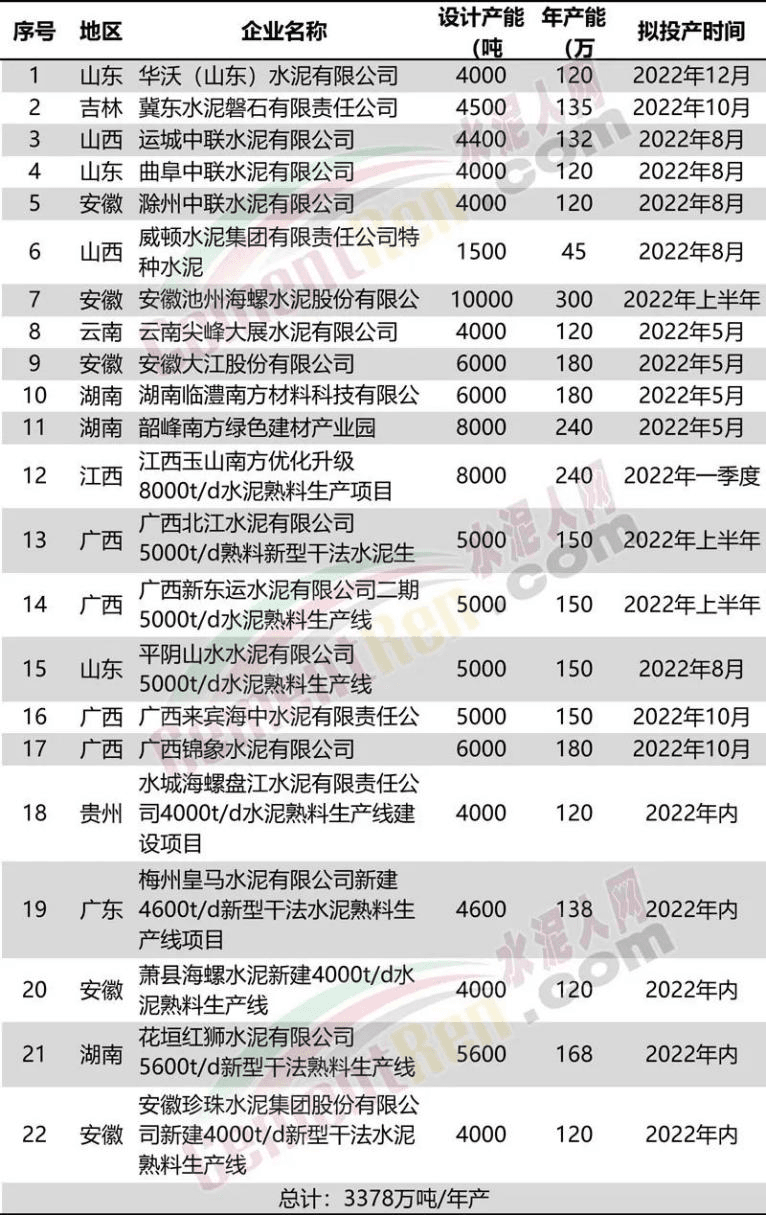 據(jù)水泥人網(wǎng)此前消息,原計(jì)劃于今年內(nèi)投產(chǎn)的22條熟料生產(chǎn)線項(xiàng),目前已點(diǎn)火和已開(kāi)建,且明確今年內(nèi)點(diǎn)火投產(chǎn)的項(xiàng)目共11條線分別為:1 江西玉山南方8000t/d水泥熟料生產(chǎn)線于2020年12月23日開(kāi)工,原計(jì)劃于今年一季度點(diǎn)火投產(chǎn)。目前熟料項(xiàng)目已經(jīng)達(dá)產(chǎn),日產(chǎn)量在9800-10200噸,道路和綠化是還在施工中;2 廣西新東運(yùn)水泥5000t/d水泥熟料生產(chǎn)線,已點(diǎn)火;3 韶峰南方8000t/d水泥熟料生產(chǎn)線,已點(diǎn)火;4 廣西錦象水泥6000t/d水泥熟料生產(chǎn)線一線暫定7月8日點(diǎn)火投產(chǎn),二線暫定下半年點(diǎn)火投產(chǎn);5 廣西都安上峰水泥一線5000t/d熟料生產(chǎn)線計(jì)劃于7月投產(chǎn);6 平陰山水水泥5000t/d水泥熟料生產(chǎn)線,計(jì)劃于8月點(diǎn)火;7 池州海螺10000t/d水泥熟料生產(chǎn)線,計(jì)劃于8月點(diǎn)火投產(chǎn);8 廣西北江水泥5000t/d水泥熟料生產(chǎn)線,原計(jì)劃上半年投產(chǎn),目前仍處于建設(shè)和設(shè)備調(diào)試中。上周內(nèi)回轉(zhuǎn)窯筒體吊裝合攏,預(yù)計(jì)于今年下半年內(nèi)點(diǎn)火投產(chǎn);9 水城海螺盤(pán)江水泥4000t/d水泥熟料生產(chǎn)線已開(kāi)工建設(shè),原計(jì)劃于2022年底前點(diǎn)火投產(chǎn);10 安徽珍珠水泥4000t/d水泥熟料生產(chǎn)線已開(kāi)工建設(shè),原計(jì)劃于今年內(nèi)點(diǎn)火投產(chǎn)。