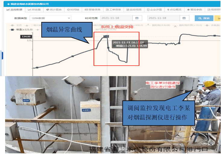 據通報,福建泉州海峽水泥股份有限公司在煙溫探測儀上加裝電阻器件,致使自動監測煙氣流量、排放量減少。經調查證實,11月18日該公司中控室主任曾某發現窯尾煙氣煙溫出現異常后,擅自指使電工李某在煙溫探測儀后端傳輸線路接線板上加裝電阻器件,致使該公司自動監測數據失真,煙氣流量變小,二氧化硫、氮氧化物等污染物排放量減少,12月6日曾某指使李某拆除該電阻器件。