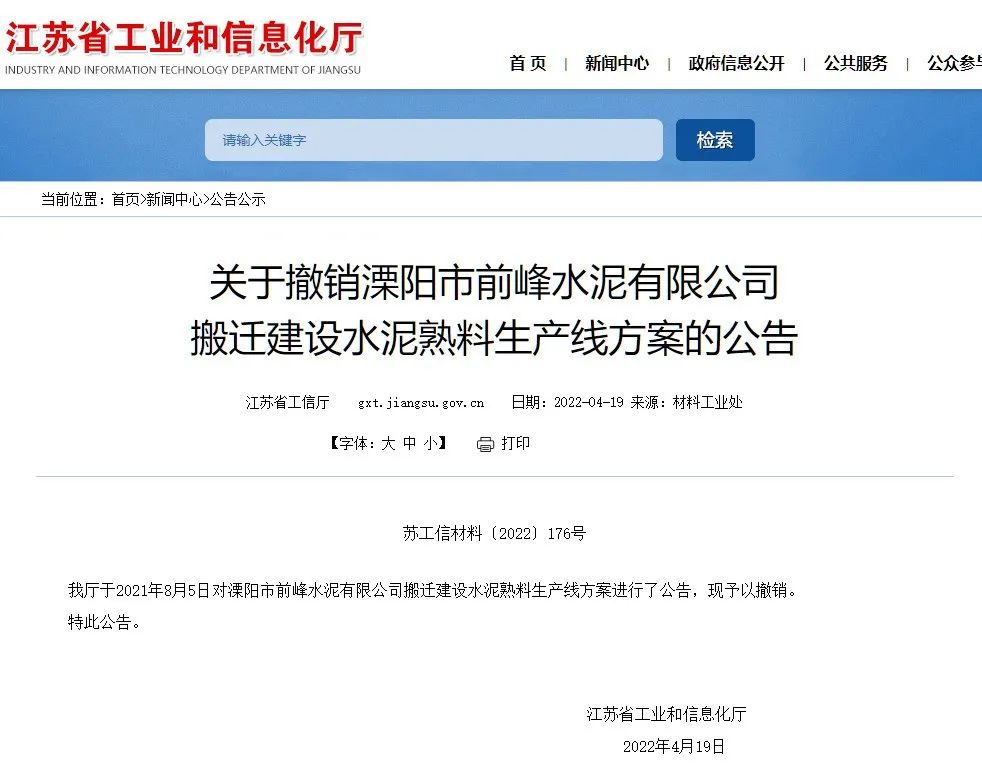 今年4月19日,江蘇省工信廳發布公告稱,撤銷2021年8月5日發布的《溧陽市前峰水泥有限公司搬遷建設水泥熟料生產線方案公告》。