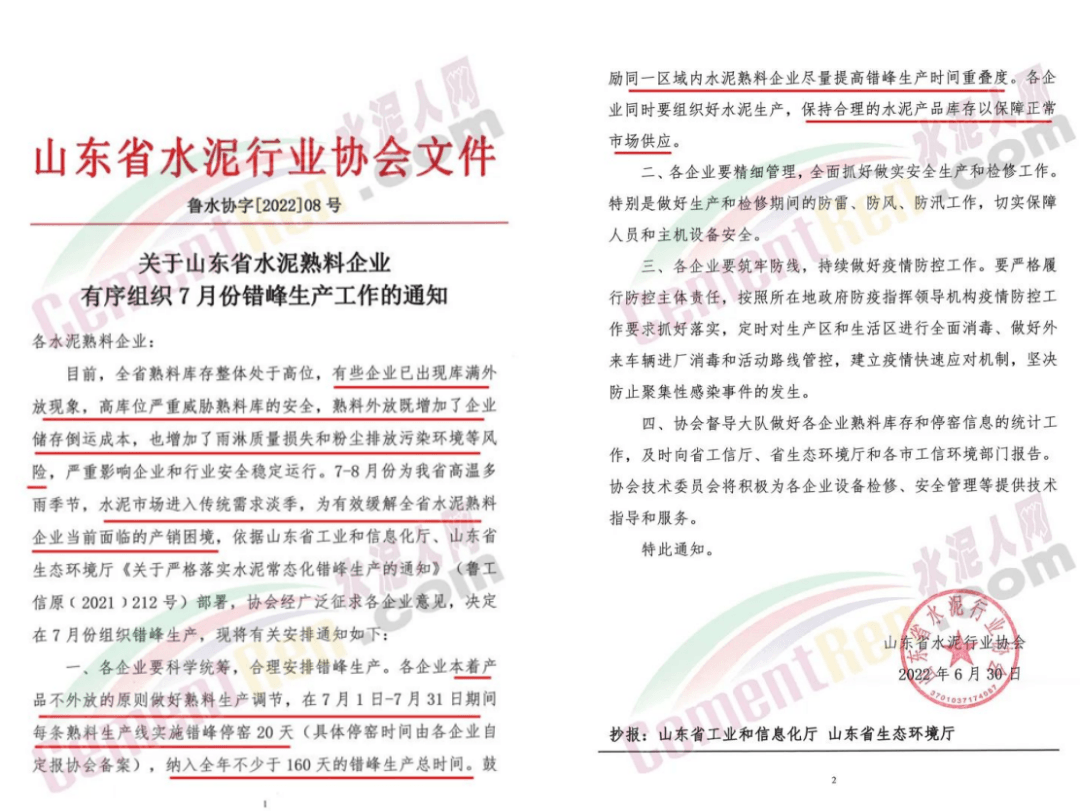 山東省水泥行業(yè)協(xié)會發(fā)布《關于山東省水泥熟料企業(yè)有序組織7月份錯峰生產工作的通知》提到,全省熟料庫存整體處于高位,有些企業(yè)已出現(xiàn)庫滿外放現(xiàn)象,高庫位嚴重威脅熟料庫的安全,熟料外放既增加了企業(yè)儲存倒運成本,也增加了雨淋質量損失和粉塵排放污染環(huán)境等風險。通知要求各企業(yè)本著產品不外放的原則做好熟料生產調節(jié),在7月1日-31日期間每條熟料生產線實施錯峰停窯20天,納入全年不少于160天的錯峰生產總時間。