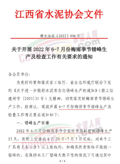 江西省水泥協(xié)會也在近日發(fā)布關于開展2022年6-7月梅雨季節(jié)錯峰生產及檢查工作有關要求的通知,全省所有熟料窯線錯峰生產15天,對單一工廠具有2條(含)以上窯線的,如確實所有窯線不能統(tǒng)一錯峰,在保持本工廠錯峰天數(shù)不變的情況下可通過其中的1條或2條窯線進行調節(jié)置換。計劃外停窯的不納入本次錯峰生產時間。