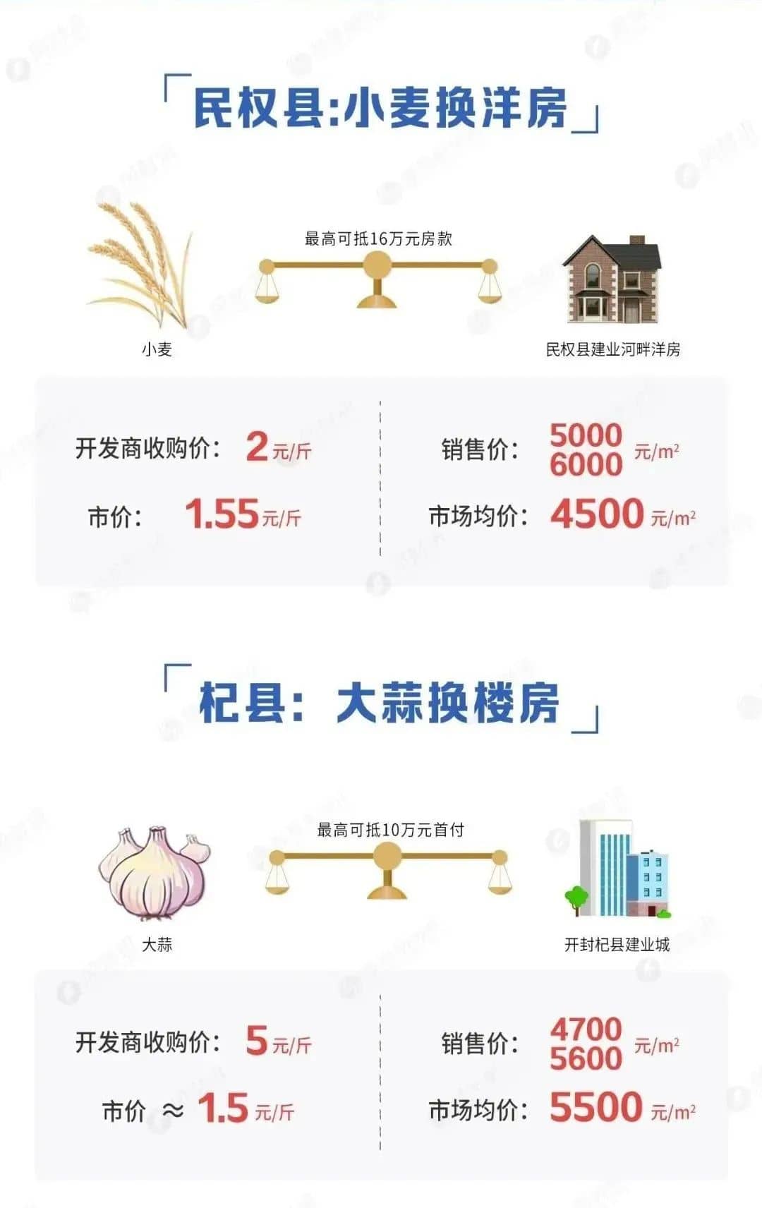 河南商丘民權縣建業地產的一個樓盤就以 “愛心助農”的口號,高價收高小麥抵首付,2元/斤,最高可抵 16萬房款。建業地產在河南開封杞縣還推出了大蒜抵房款。