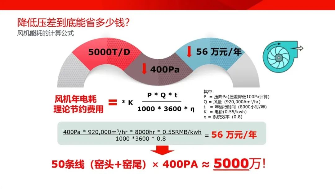 以戈爾濾袋5年使用壽命算算,一條日產5000的熟料生產線計算:一年運行8000小時,風量920000立方小時,壓降400pa,風機效率80%,電價0.55元度,年降低費用56萬。一家集團企業(yè)50條窯線(窯頭、窯尾),可節(jié)約5000萬/年。