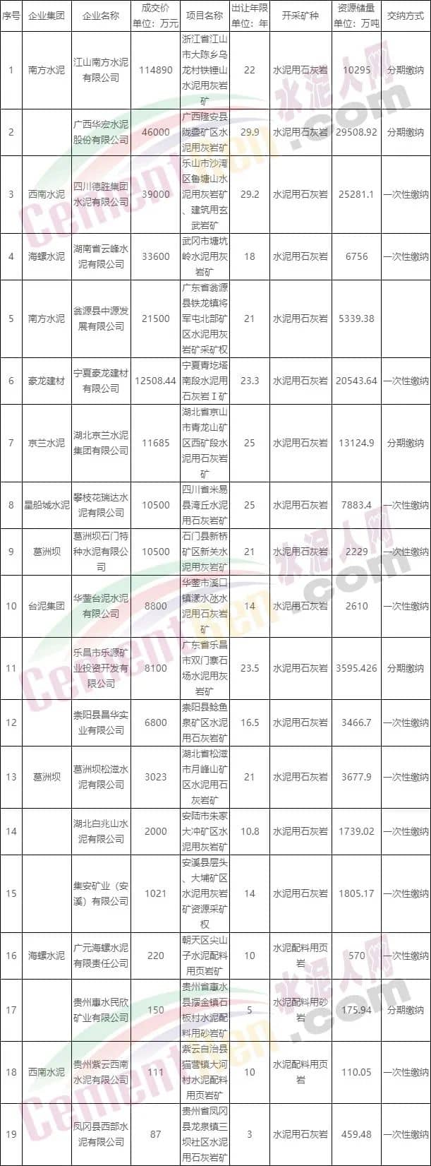19處礦山中有12處分別由中國建材集團、海螺水泥、葛洲壩水泥、臺泥集團、豪龍建材、京蘭水泥、星船城水泥等龍頭企業競得。其中中國建材旗下西南水泥、南方水泥、海螺水泥,葛洲壩水泥各競得兩處礦山,京蘭水泥、豪龍建材、臺泥集團、星船城水泥各競得一處礦山。